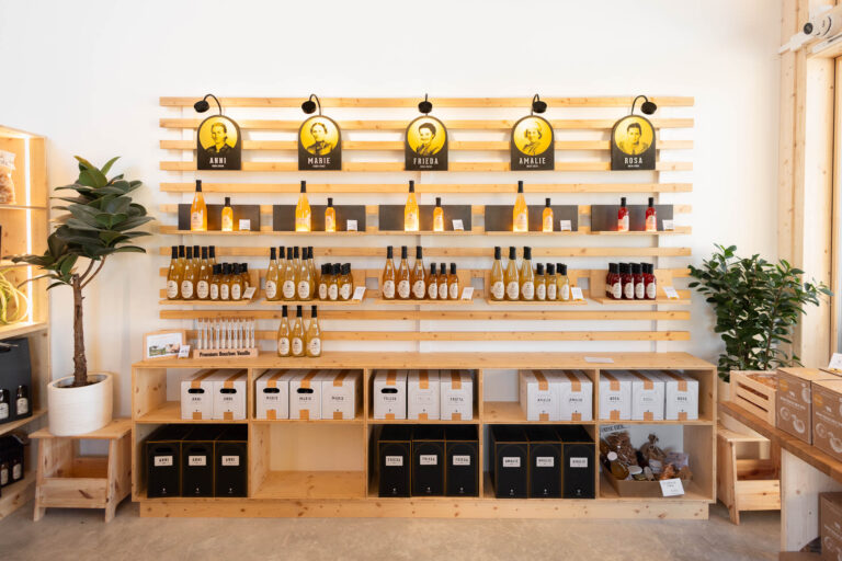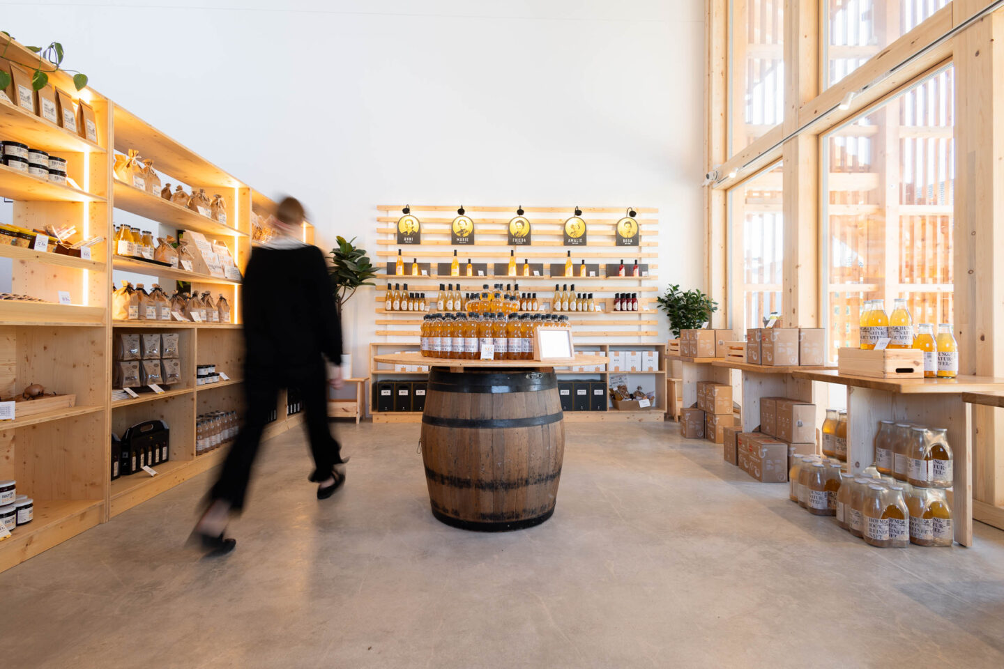 Im brandneuen Hofladen zeigt sich die Vielfalt der fünf Sorten in einem besonderen Rahmen: Auf goldschimmernden Holzplatten präsentiert, reflektiert jede Flasche ihre eigene Persönlichkeit. Sanftes Licht aus dem Sockel lässt die Farben des flüssigen Goldes strahlen – eine Inszenierung, die Genuss schon beim Anblick verspricht.