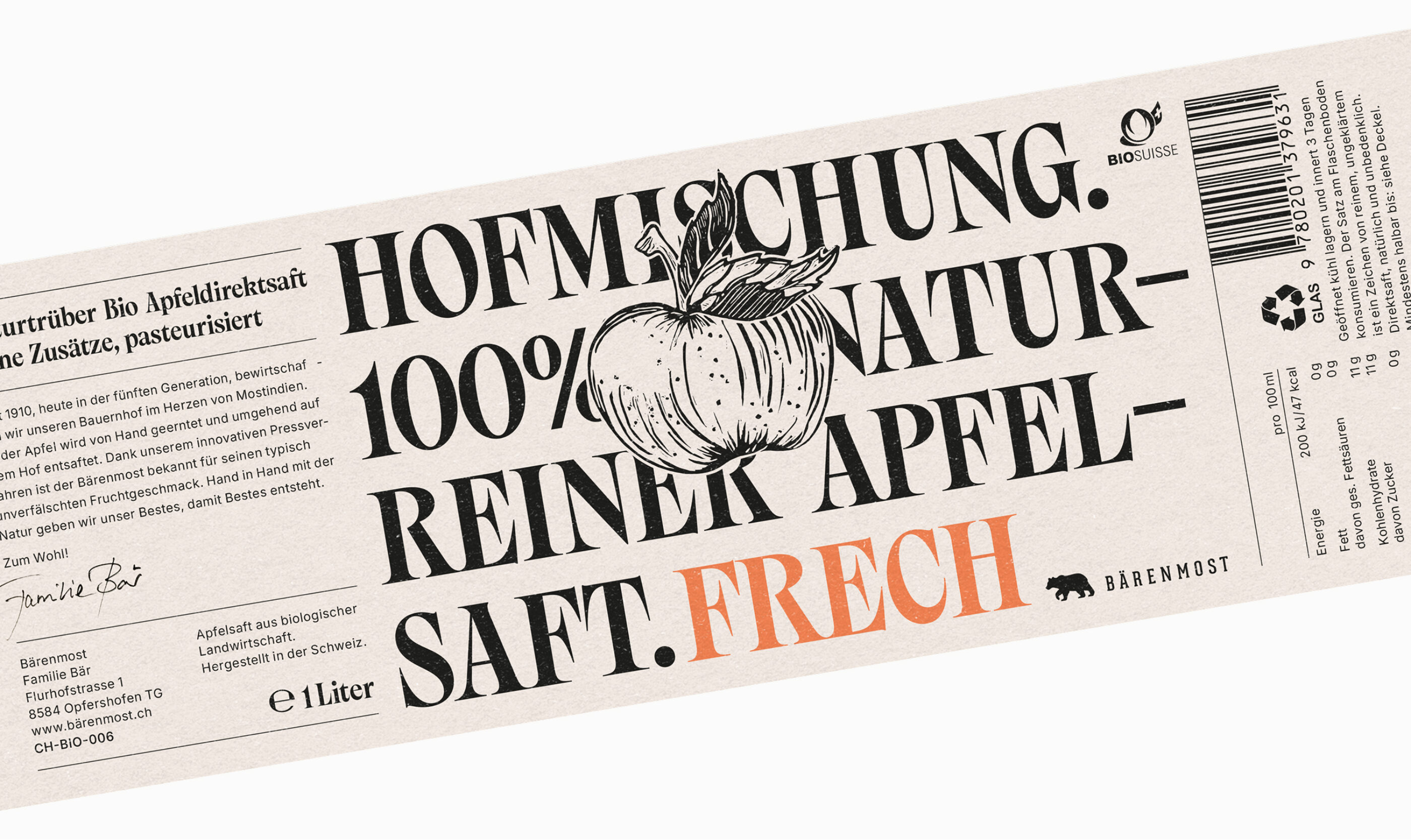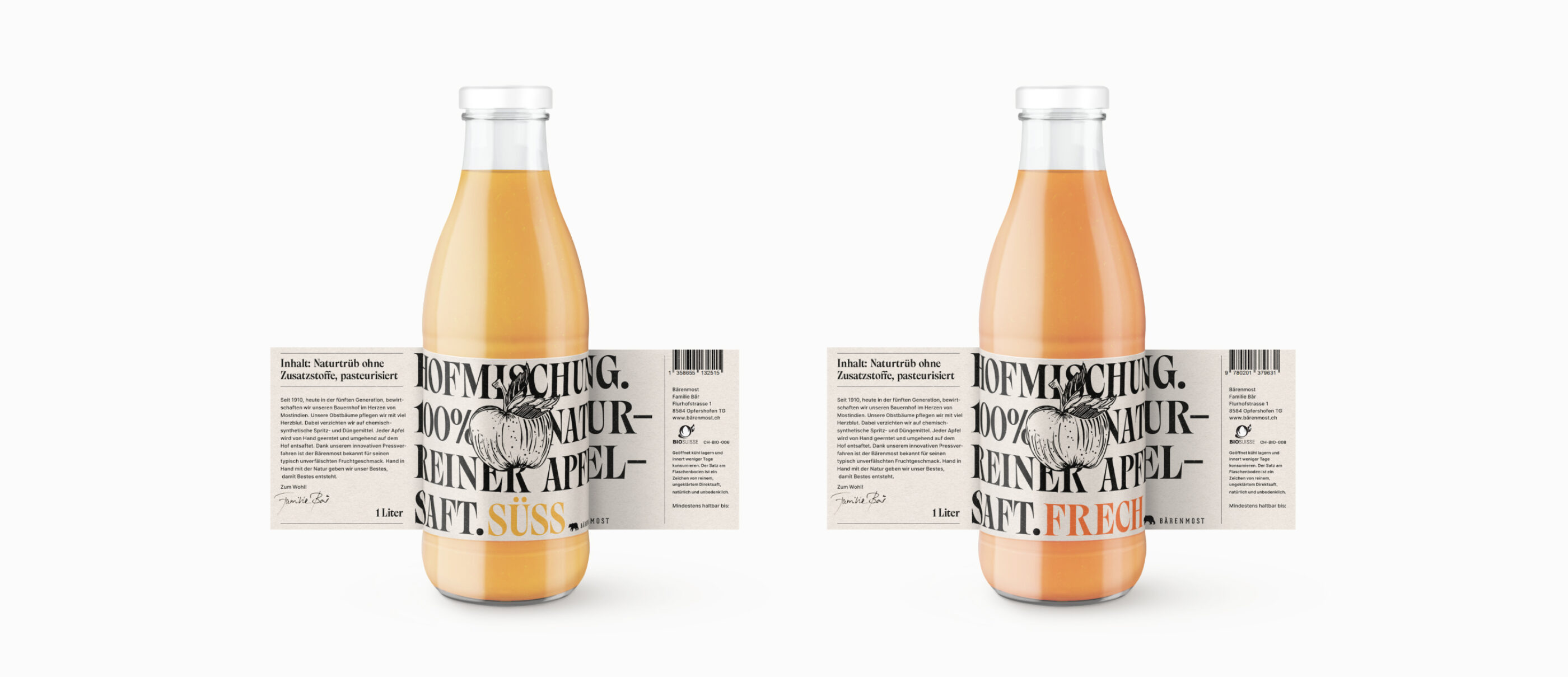 Das Alltagsprodukt vom Mostgut zeigt sich im neuen Look. Mal süss, mal frech – die beiden Sorten überzeugen mit eigener Farbe und unverwechselbarem Charakter. Genauso ausdrucksstark darf auch das Etikett auftreten.
