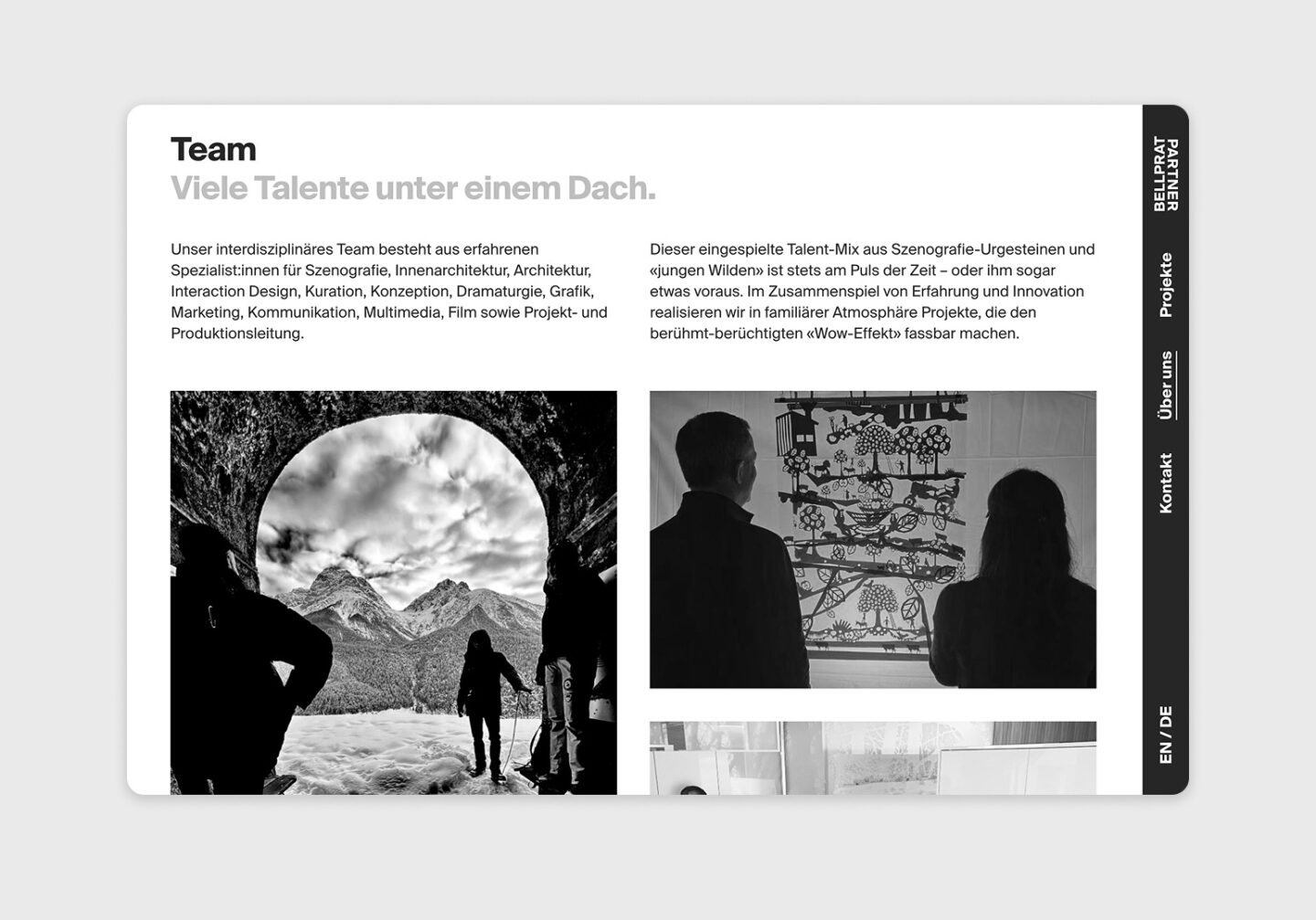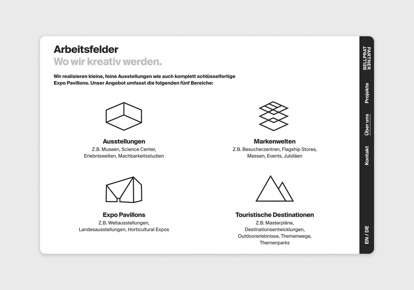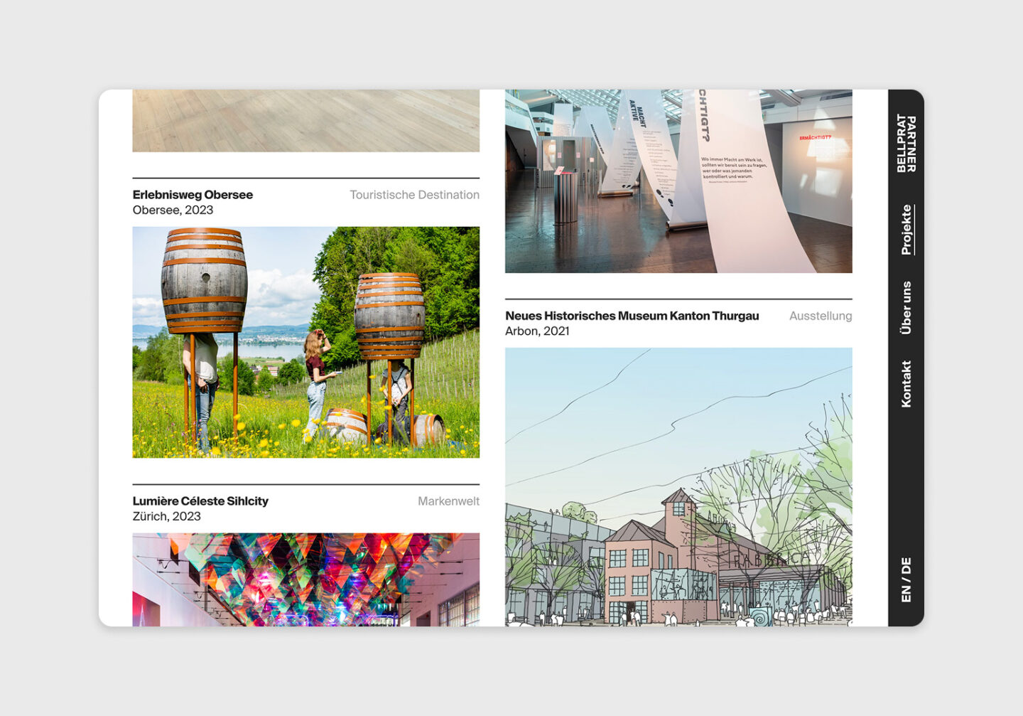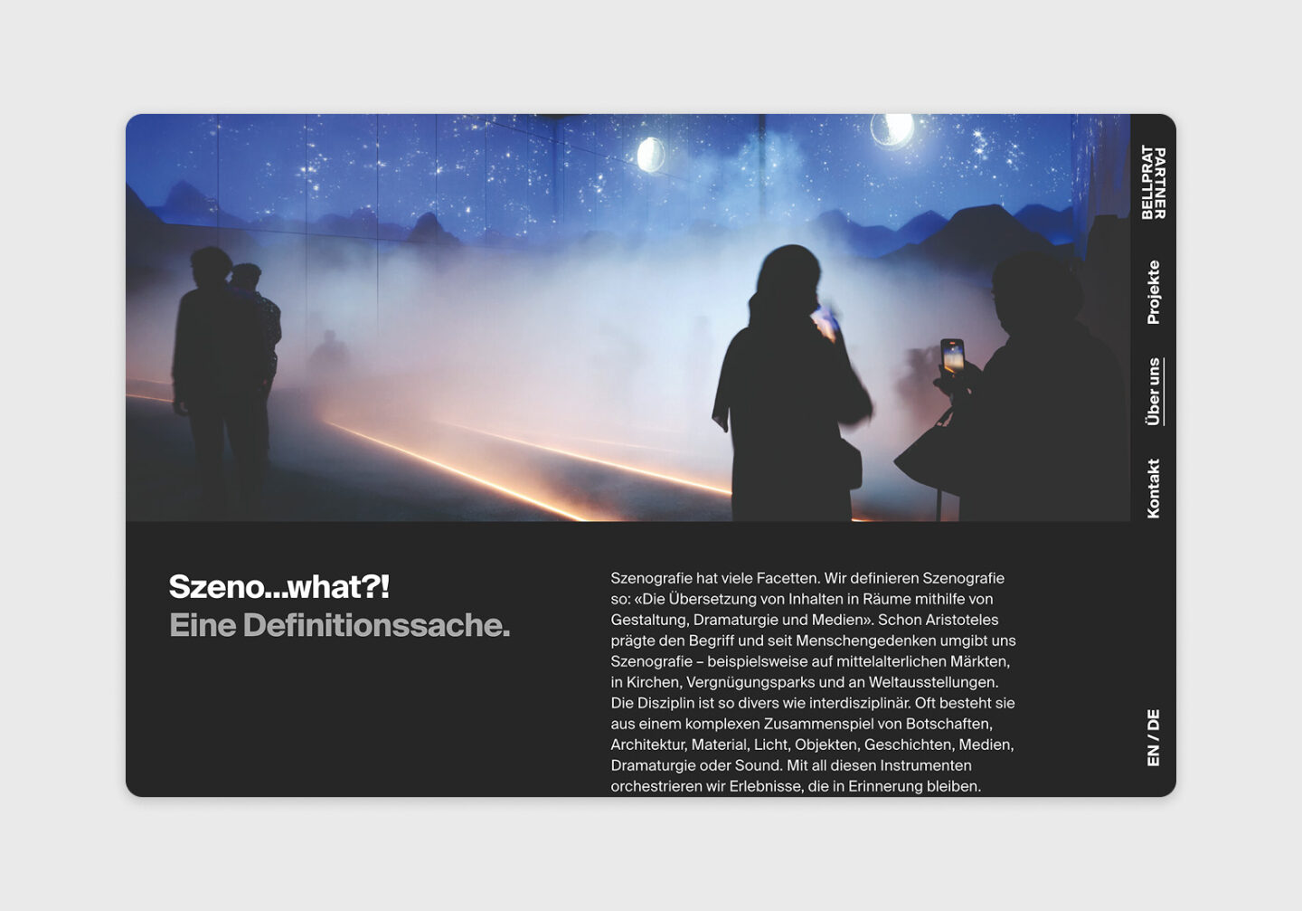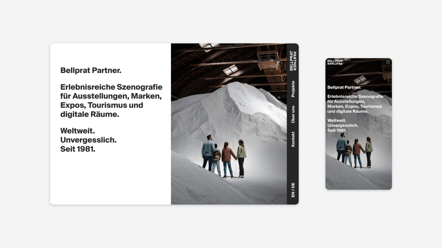 Für Bellprat Partner – ein interdisziplinäres Büro für Szenografie – durften wir das von ihnen gestaltete Visual Screendesign digital umsetzen und programmieren. In einem gemeinsamen Prozess entstand eine klare, modulare Website, die die kreative Vision emotional treu und technisch präzise übersetzt. Die neue Plattform bringt die Erlebniswelten von Bellprat Partner auch digital zum Strahlen – weltweit, seit 1981.
