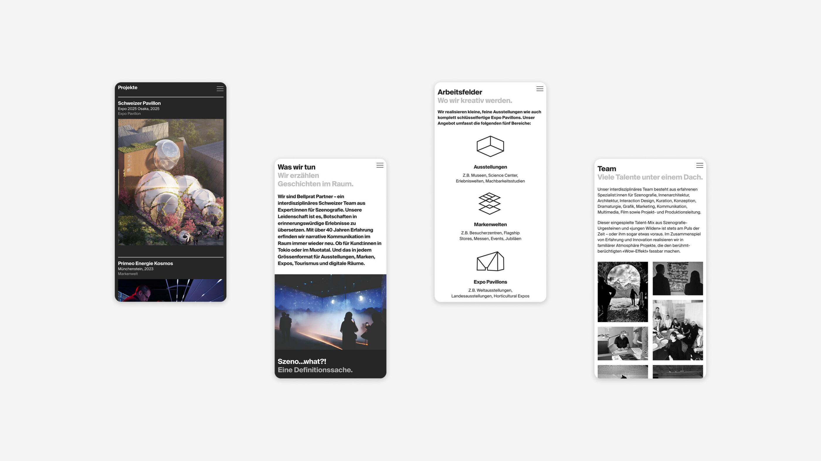 Für Bellprat Partner – ein interdisziplinäres Büro für Szenografie – durften wir das von ihnen gestaltete Visual Screendesign digital umsetzen und programmieren. In einem gemeinsamen Prozess entstand eine klare, modulare Website, die die kreative Vision emotional treu und technisch präzise übersetzt. Die neue Plattform bringt die Erlebniswelten von Bellprat Partner auch digital zum Strahlen – weltweit, seit 1981.