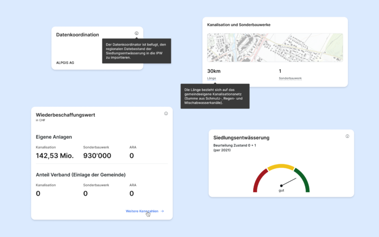 Die Info-Kacheln folgen einem einheitlichen Layout, das Diagramme, Kennzahlen und Zahlenwerte klar strukturiert und die Inhalte leicht erfassbar macht. Kontextinformationen, wie Begriffsdefinitionen und erklärende Hinweise, ergänzen die Inhalte passend zu den dargestellten Daten. Die Eingabemasken wurden so gestaltet, dass sie eine verbesserte Benutzerführung bieten: mit klaren Labels, einer deutlichen Unterscheidung zwischen bearbeitbaren und schreibgeschützten Feldern sowie einer Eingabevalidierung zur Sicherstellung der Datenqualität.