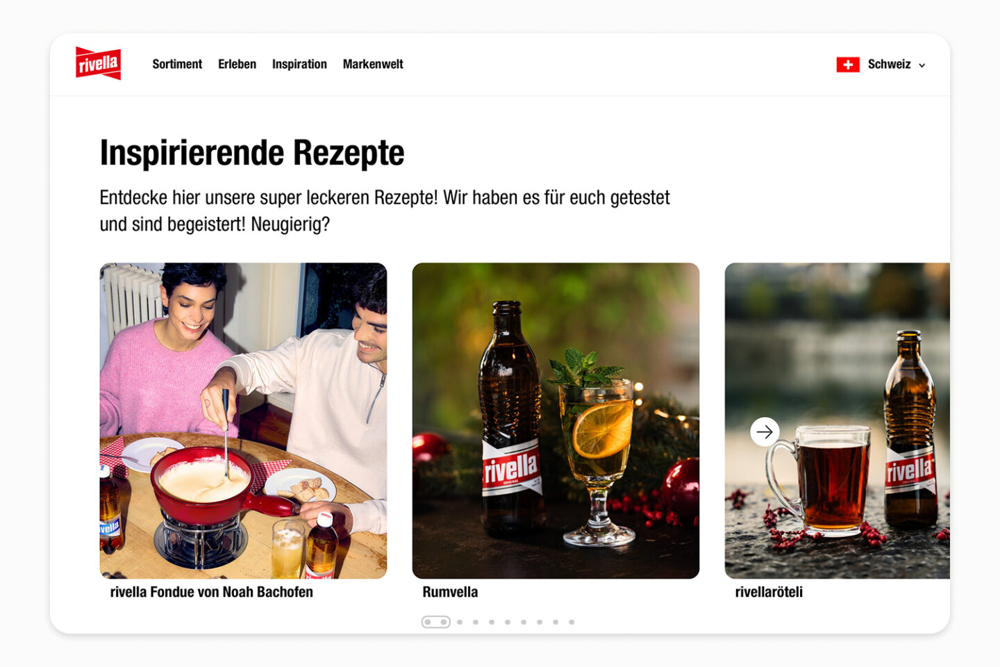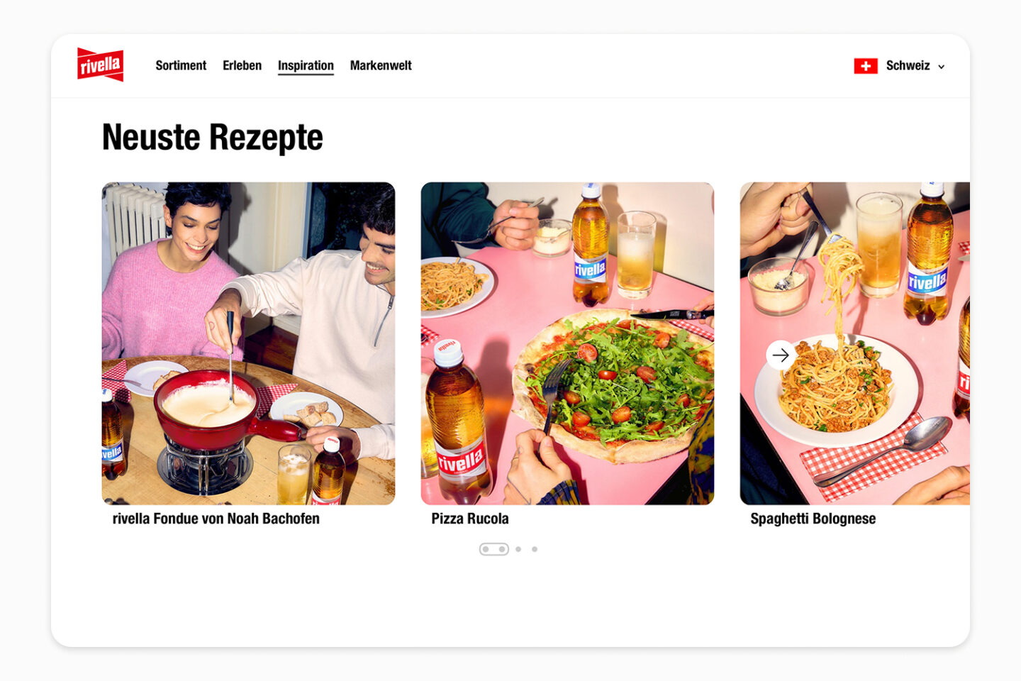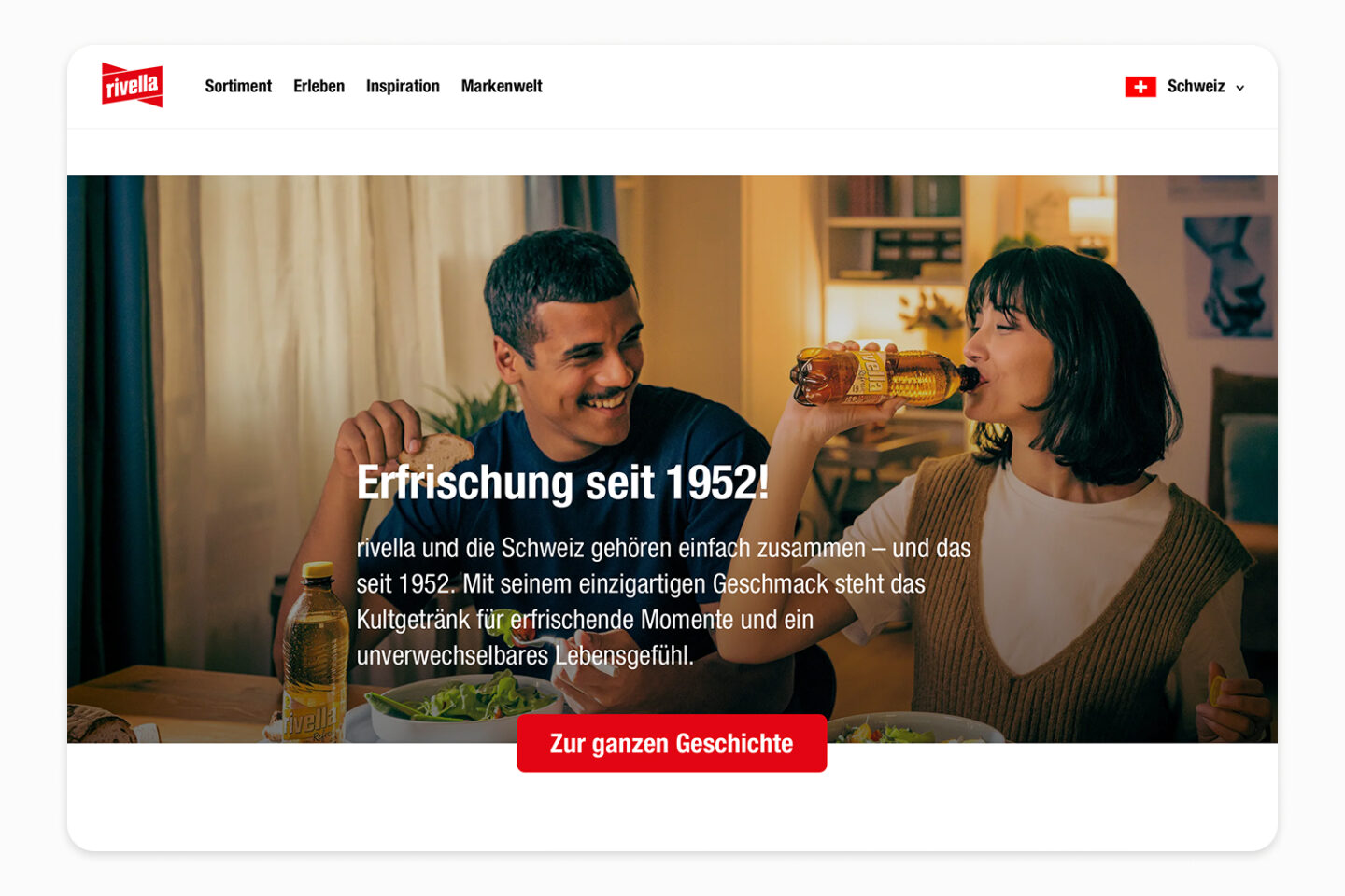 Die mobile Version der Rivella-Website ist schnell, übersichtlich und leicht zu bedienen. Inhalte sind klar gegliedert und lassen sich mit dynamischen Animationen vertikal erkunden.