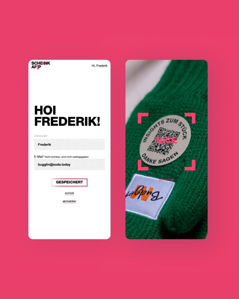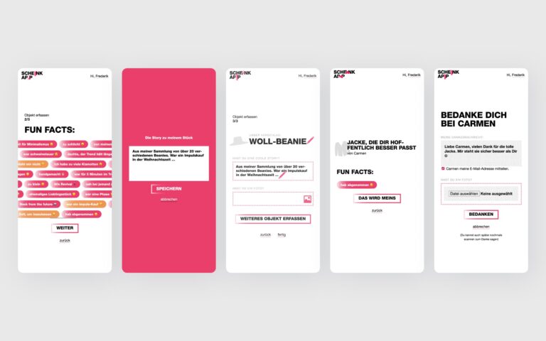 - Zur Förderung der Interaktion und des Teilens in der Gemeinschaft haben wir die «Schenk-App» entwickelt. Jedes gespendete Kleidungsstück wird beim Check-in mit einem QR-Code versehen, der eine persönliche Verbindung zwischen dem ursprünglichen und dem neuen Besitzer herstellt. Nutzer können über diese digitale Plattform die Geschichte der getauschten Kleidungsstücke teilen und sich austauschen. Dies eröffnet eine neue Dimension der Interaktion und des Teilens in der Gemeinschaft.