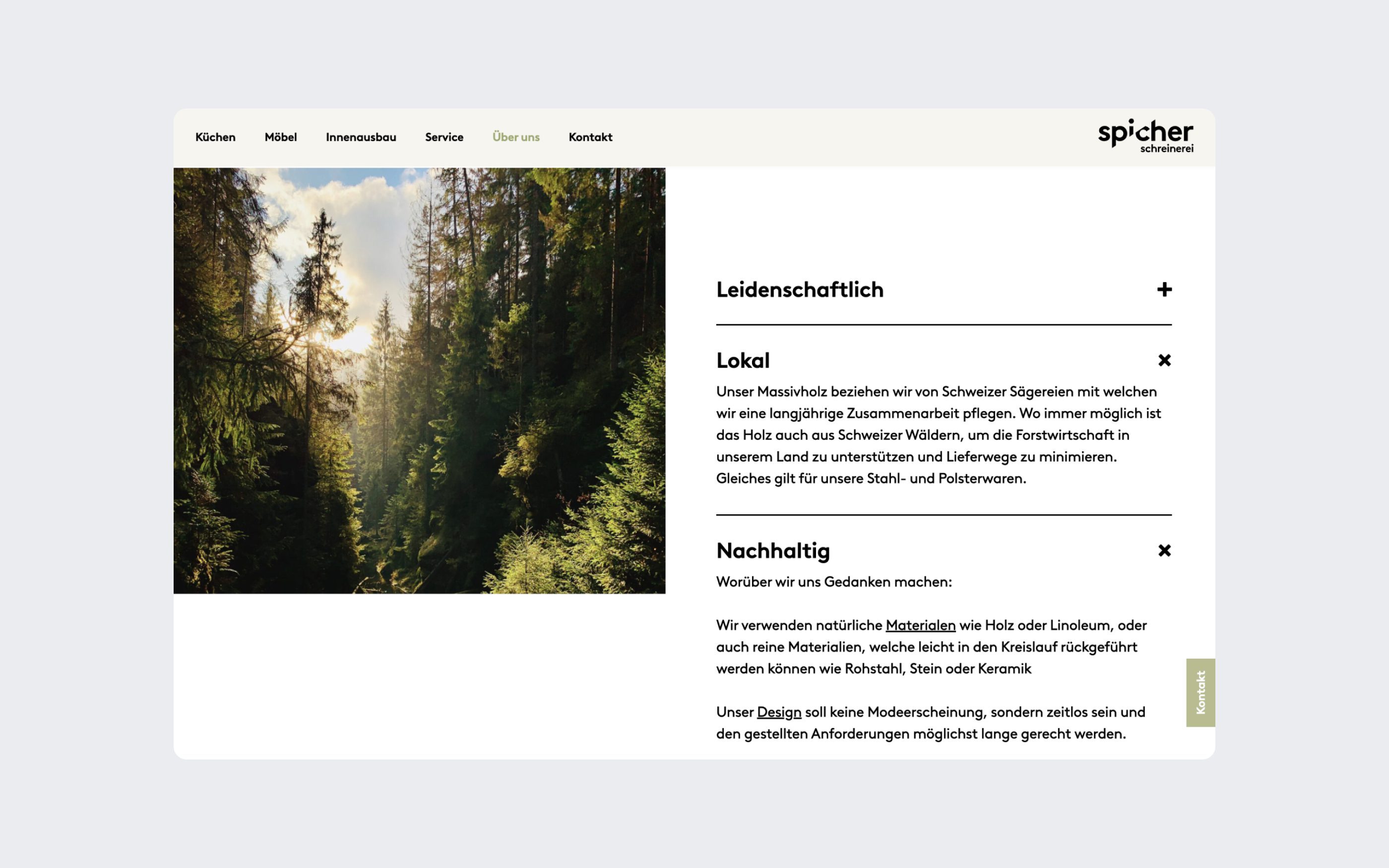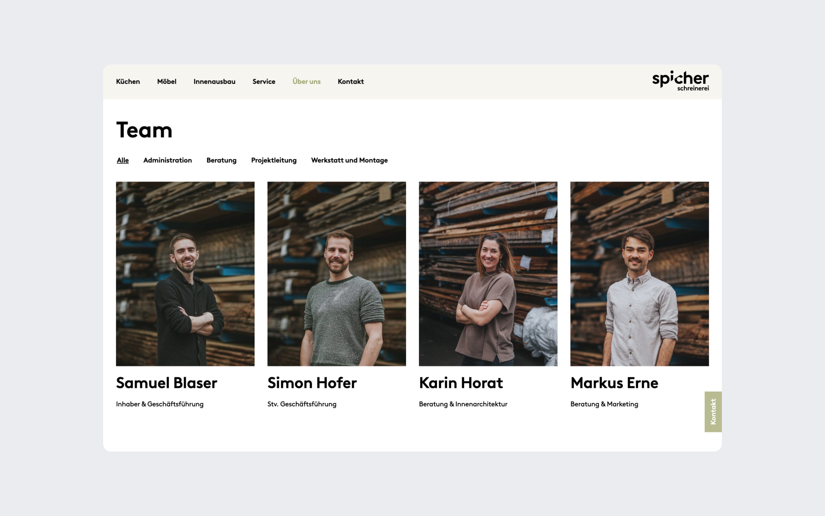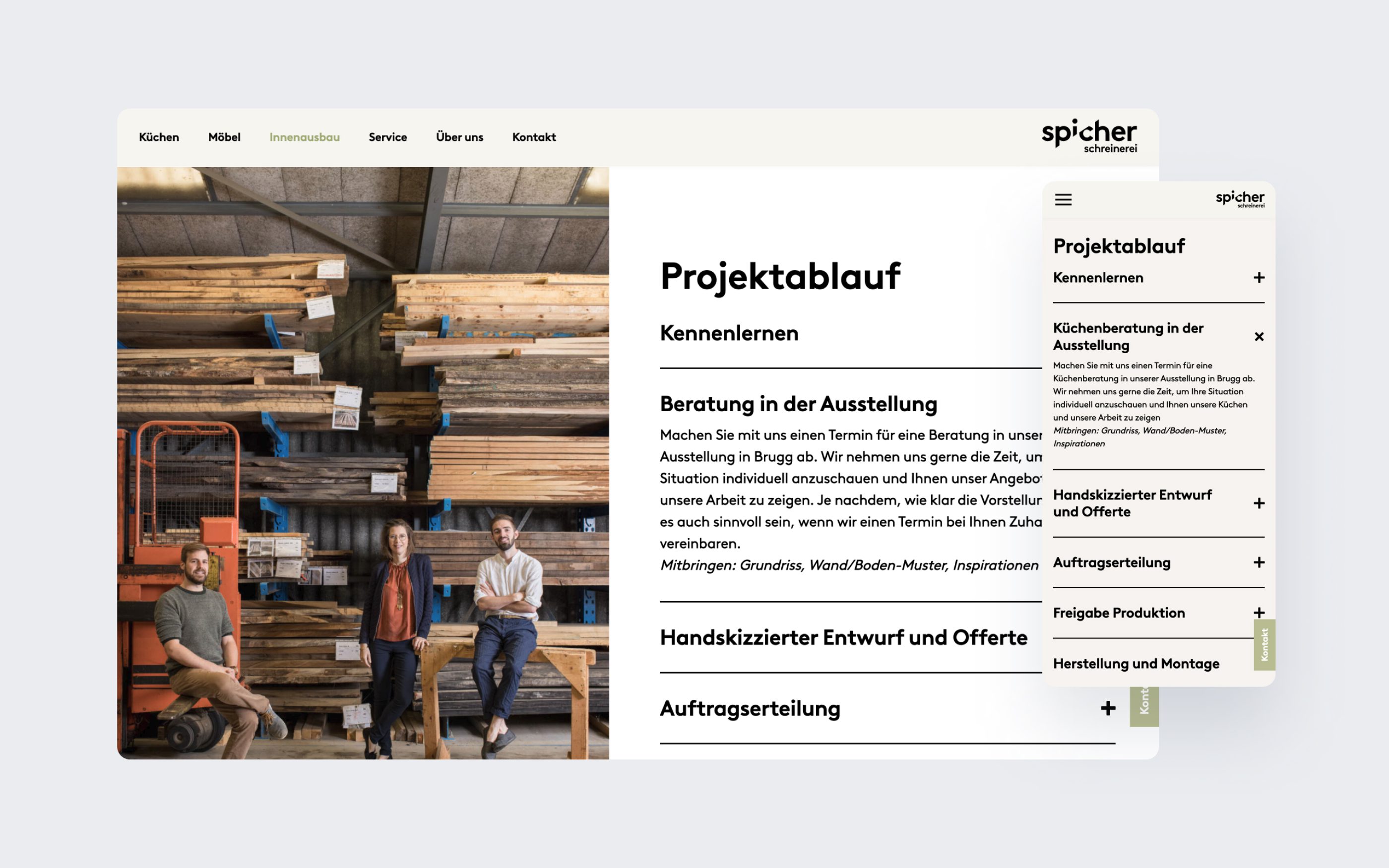 Die neu gestaltete Webseite der Schreinerei Spicher vereint Ästhetik mit Funktionalität, um die Identität der Marke online widerzuspiegeln. Dank einem klaren Fokus auf Benutzerfreundlichkeit und einem responsiven Design ermöglicht die Plattform eine nahtlose Navigation und schnelle Ladezeiten auf allen Geräten.