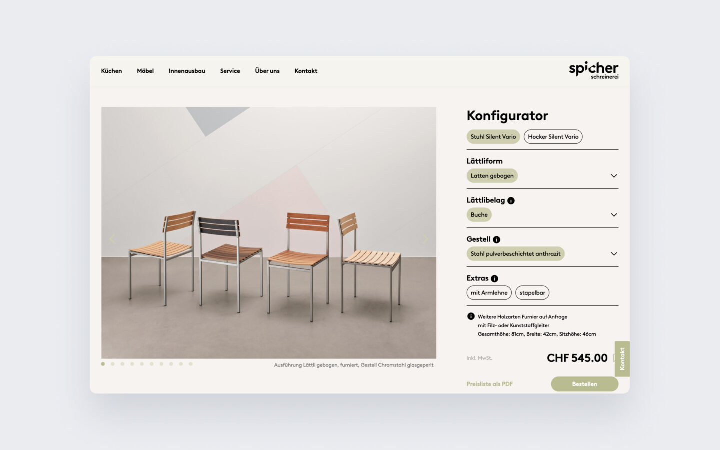 Spicher, bekannt für seine handgefertigten Möbel aus Holz und Stahl, hebt sich durch einen individuellen Konfigurator hervor. Kunden können Produkte nach ihren Wünschen gestalten und direkt online ein Beratungsgespräch vereinbaren, was die Grenze zwischen digitaler und persönlicher Erfahrung verwischt.
