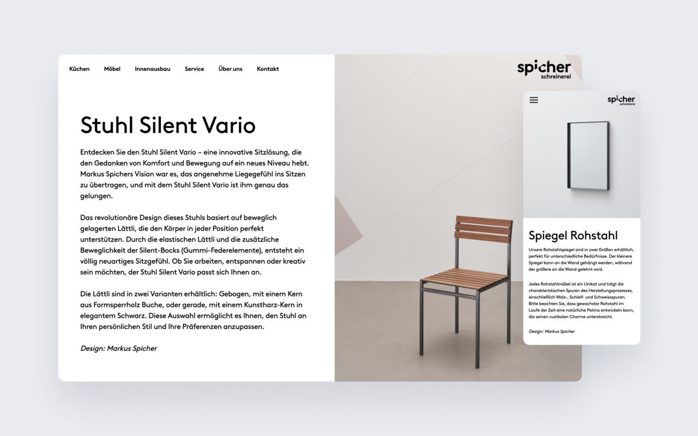 Die neu gestaltete Webseite der Schreinerei Spicher vereint Ästhetik mit Funktionalität, um die Identität der Marke online widerzuspiegeln. Dank einem klaren Fokus auf Benutzerfreundlichkeit und einem responsiven Design ermöglicht die Plattform eine nahtlose Navigation und schnelle Ladezeiten auf allen Geräten.