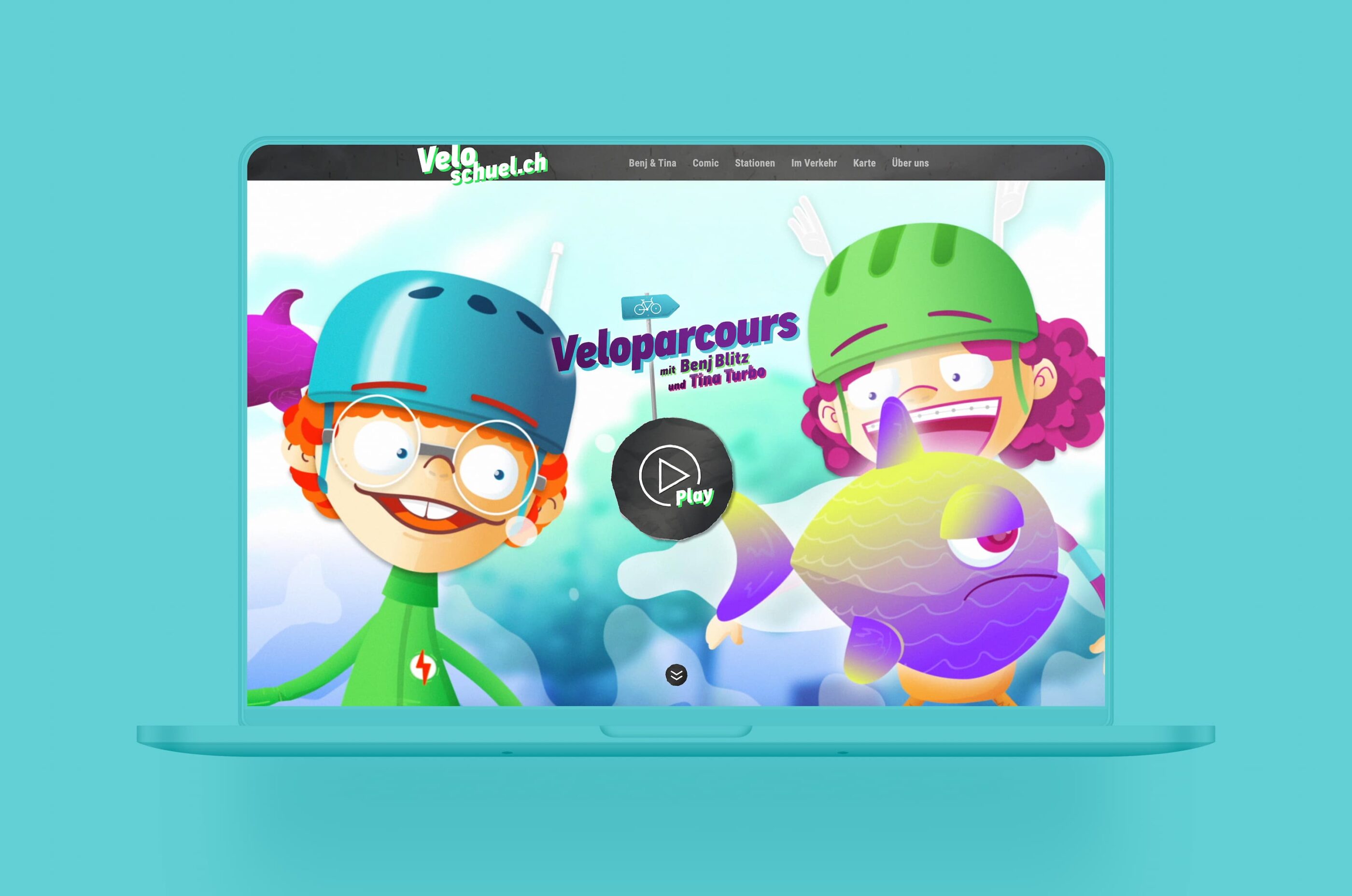 Immer weniger Kinder fahren Velo. Wer als Kind nicht Velo fährt, wird als Erwachsener kaum mehr zum Velo fahren finden. Aktive Mobilität geht so verloren. Die animierten Lern-Sequenzen «Veloparcours mit Benj Blitz und Tina Turbo» sind integraler Bestandteil der neuen Website Veloschuel.ch.
