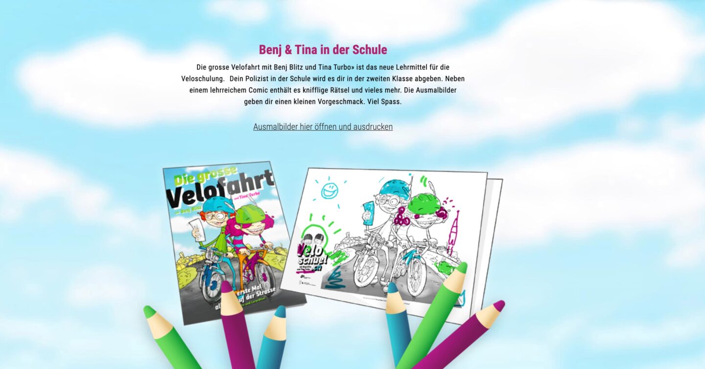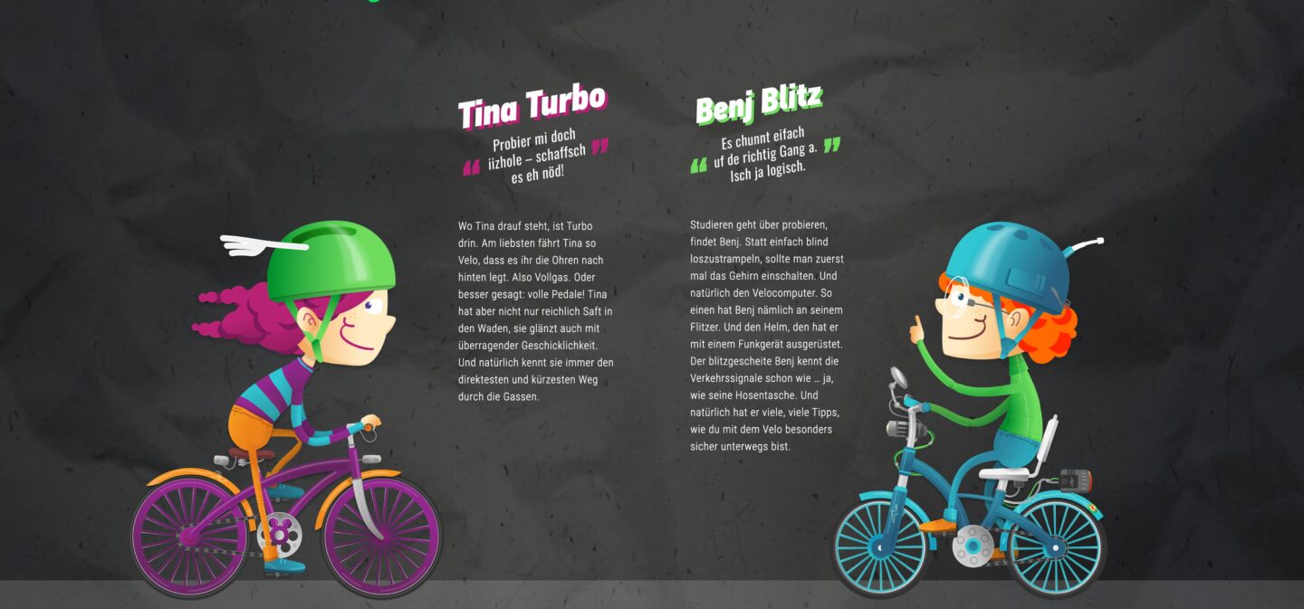 Immer weniger Kinder fahren Velo. Wer als Kind nicht Velo fährt, wird als Erwachsener kaum mehr zum Velo fahren finden. Aktive Mobilität geht so verloren. Die animierten Lern-Sequenzen «Veloparcours mit Benj Blitz und Tina Turbo» sind integraler Bestandteil der neuen Website Veloschuel.ch.